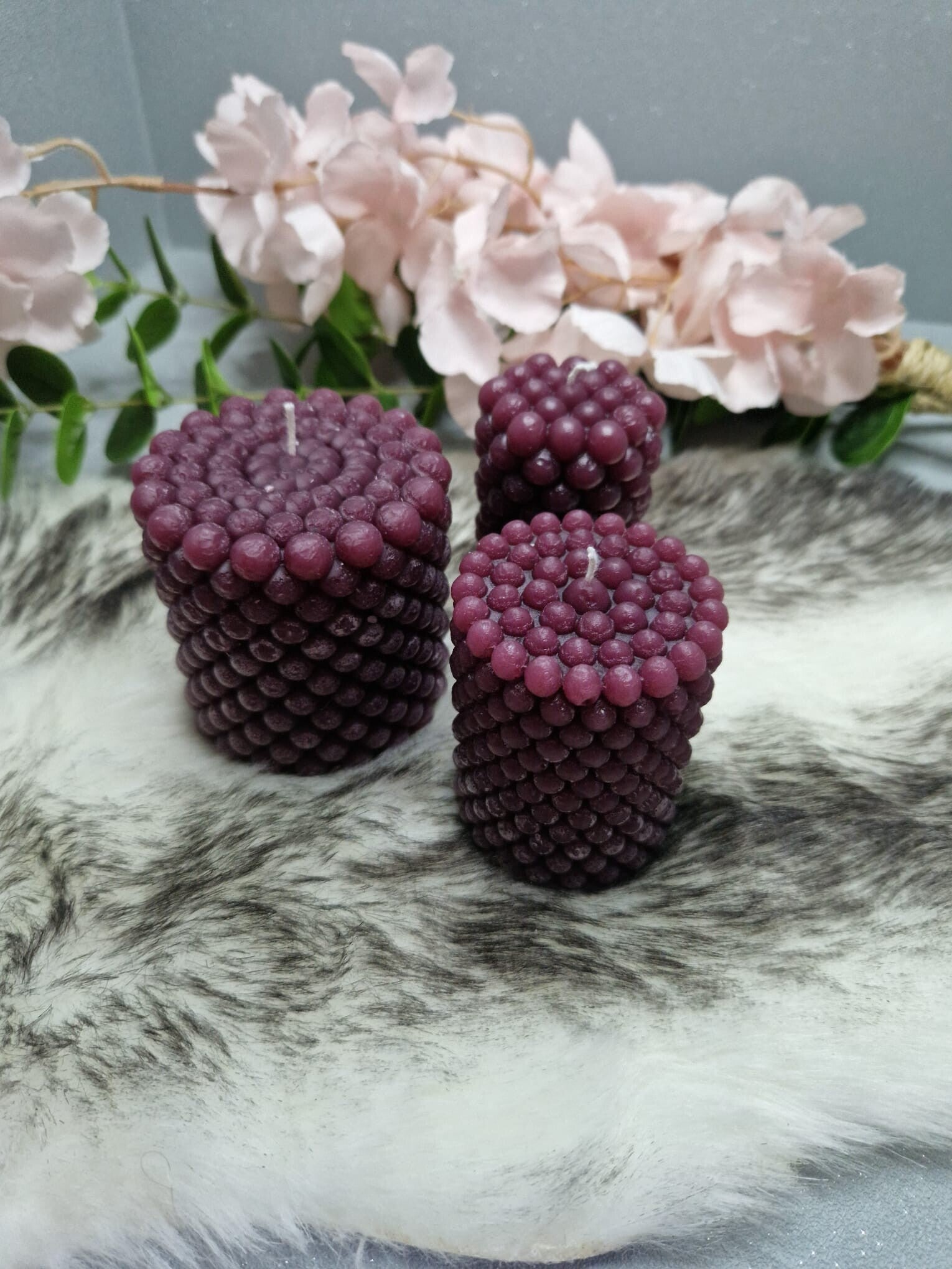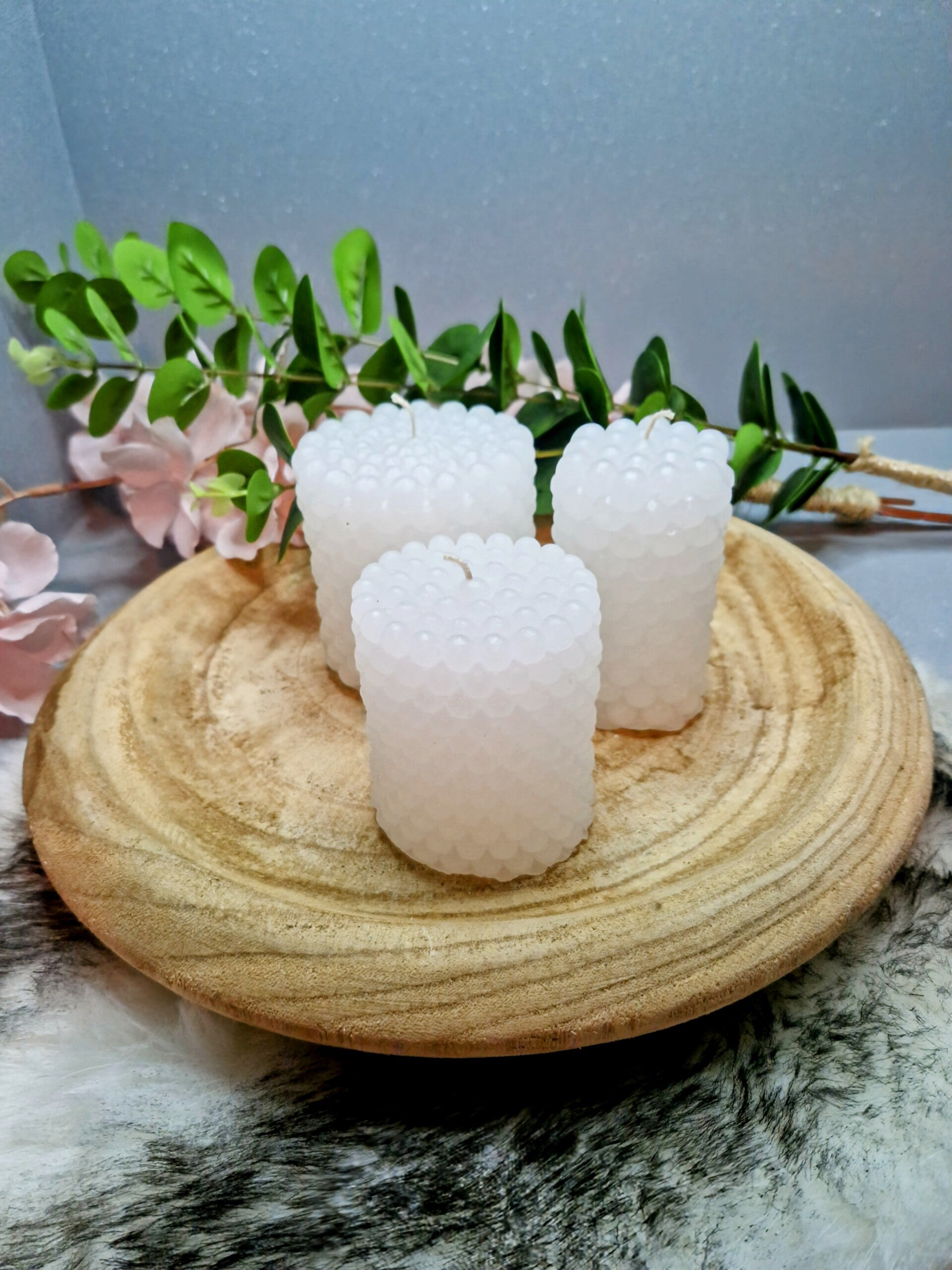 3 ronde kaarsen van een diameter 6cm, 5cm en 7,5 cm. met een hoogte van resp. 7,5 cm, 9 cm, en 8,5 cm.